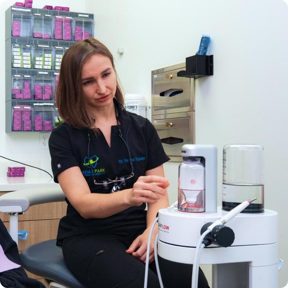 Dr. Regina Yunusov and her team proudly offer EMS AirFlow, an innovative device that combines air, water, and fine powder to remove plaque, stains, and tartar from your teeth and gums.